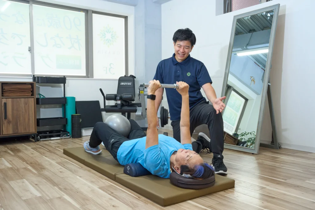 脳梗塞・脊柱管狭窄症・大腿骨骨折など、医師の診断内容を踏まえたうえで、目標に合わせたリハビリ型パーソナルトレーニングを行っています。経験豊富なスタッフが、一人ひとりの状態に合わせて、無理なくサポートします。