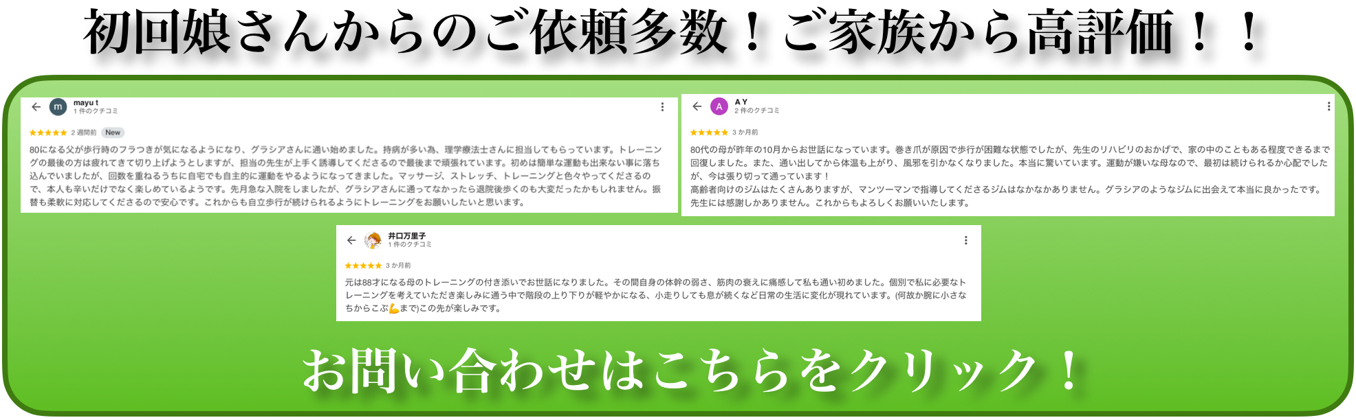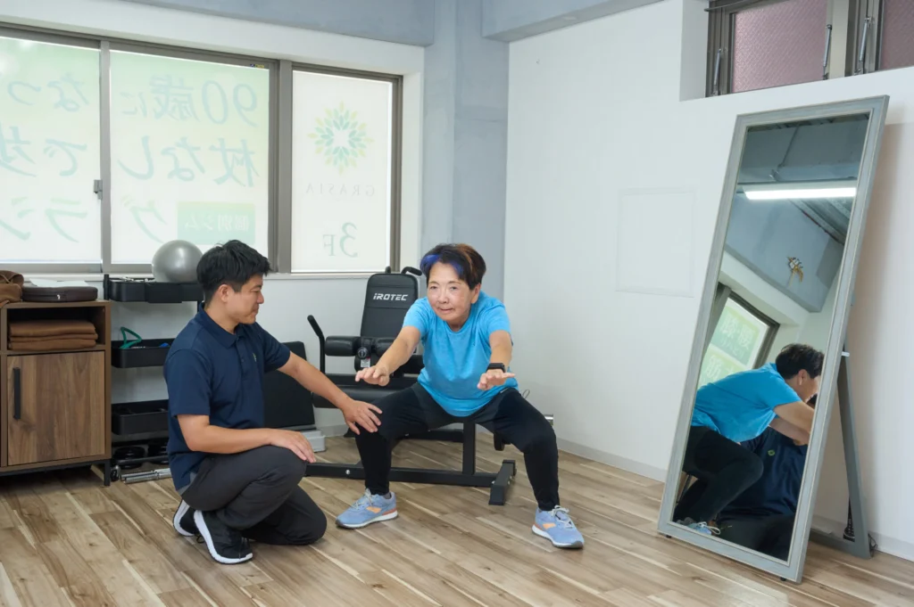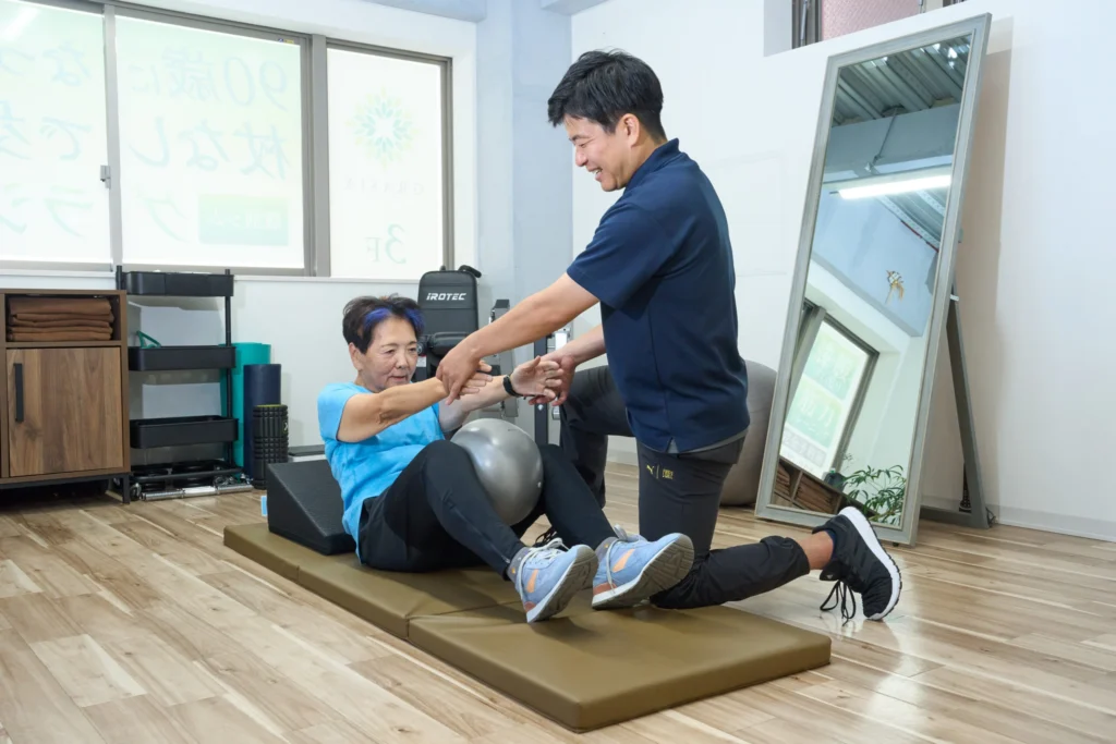 グラシアは、高齢者専門のパーソナルジムです。90歳以上の方も実際に通われ、寝たきりに近い状態から、杖なしで歩ける生活を続けている方もいらっしゃいます。年齢に関係なく、一歩踏み出すことで、身体は少しずつ変わっていきます。
